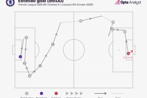 據(jù)Opta統(tǒng)計,10名切爾西球員(埃斯特旺被計算在內(nèi))參與埃斯特旺的進球,整個過程僅用28秒。