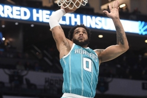黃蜂球員布里奇斯首節(jié)表現(xiàn)相當(dāng)出色,他兩度迎著濃眉防守命中三分,并且還有空接暴扣的精彩表現(xiàn)。