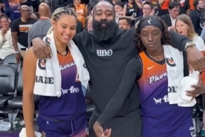 左擁右抱的!哈登觀戰(zhàn)菲尼克斯水星 與薩巴利和庫珀相擁慶祝