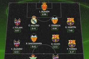 體育資訊9月22日訊 西甲第五輪戰(zhàn)罷,數(shù)據(jù)網(wǎng)站W(wǎng)hoscored也評選出本輪西甲最佳陣,費(fèi)蘭等巴薩3人在列,米利唐如選。以下為具體陣容: