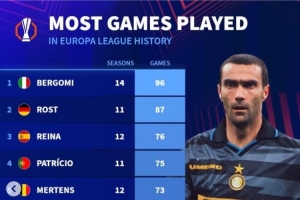 體育資訊9月25日訊 德轉(zhuǎn)統(tǒng)計(jì)了歐聯(lián)(含前身歐洲聯(lián)盟杯)球員出場(chǎng)數(shù)據(jù),貝爾戈米96場(chǎng)成為出場(chǎng)王,雷納、曾加位居前十。