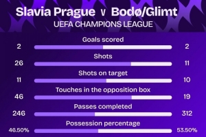 此役布拉格斯拉維亞射正11次,博德閃耀射正10次。據(jù)Squawka統(tǒng)計,這是近10個賽季第3場雙方都射正10+的歐冠比賽,前2場為2017年萊比錫vs貝西克塔斯、2020年薩爾茨堡vs拜仁。