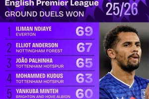 體育資訊11月11日訊 英超聯(lián)賽已經(jīng)進(jìn)行了11輪,squakwa也統(tǒng)計了本賽季英超地面成功對抗次數(shù),埃弗頓前鋒恩迪亞耶居首。