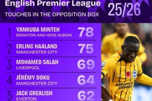 本賽季英超在對方禁區(qū)內(nèi)觸球榜: