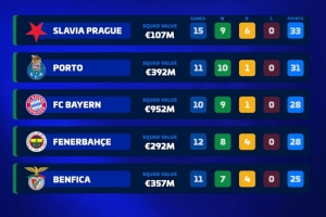 布拉格斯拉維亞(身價(jià)1.07億歐)——9勝6平積33分