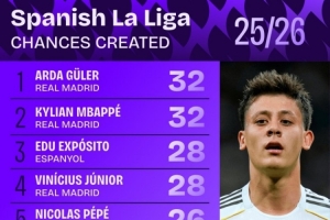 本賽季西甲創(chuàng)造機會次數(shù):居萊爾、姆巴佩32次最多
