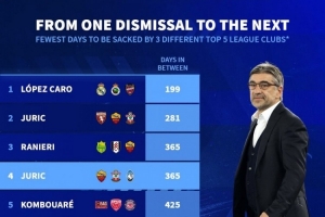 本世紀五大聯(lián)賽教練最短時間被三家俱樂部解雇排名: