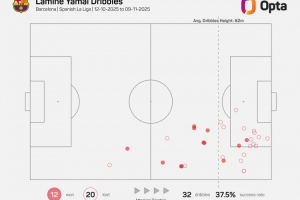 Opta指出,10月12日以來,亞馬爾聯(lián)賽嘗試過人32次,與圖盧茲球員博霍并列五大聯(lián)賽最多,過人成功率37.5%。