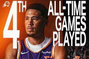此役,布克首發(fā)。據(jù)統(tǒng)計,這是布克太陽生涯第686場比賽,超越迪克·范阿斯代爾(685),升至隊史第4多。