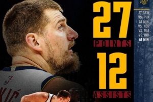 賽季個(gè)人第七次三雙!掘金官方曬約基奇本場(chǎng)數(shù)據(jù):27分10板12助