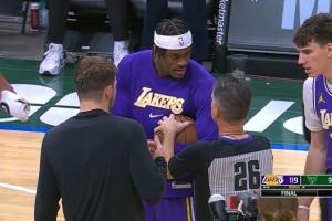 體育資訊11月16日訊 在今日湖人戰(zhàn)勝雄鹿的賽后,雙方球員以及裁判針對(duì)比賽用球展開了一段拉扯。