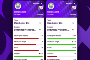 體育資訊11月18日訊 Squawka統(tǒng)計(jì)了哈蘭德22-23賽季(英超36球創(chuàng)紀(jì)錄)和本賽季的數(shù)據(jù),并做出對(duì)比。