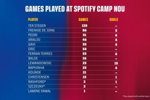 在當(dāng)前陣容中,五位隊(duì)長(zhǎng)中的四位占據(jù)了隊(duì)內(nèi)諾坎普球場(chǎng)出場(chǎng)次數(shù)榜的前列:特爾施特根、弗蘭基·德容、佩德里和阿勞霍。
