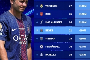 體育資訊9月30日訊 此前有報(bào)道稱曼城等球隊(duì)有意引進(jìn)巴黎球員內(nèi)維斯,德轉(zhuǎn)也盤(pán)點(diǎn)了目前世界足壇中前衛(wèi)球員身價(jià)榜,其中佩德里以1.4億歐居首,內(nèi)維斯高居第五。具體如下: