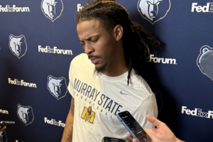 體育資訊10月2日訊 莫蘭特在訓(xùn)練營特地穿上了母校莫瑞州立大學(xué)的T恤。在采訪的時(shí)候,莫蘭特表示自己每天都會(huì)穿莫瑞州立大學(xué)的裝備。