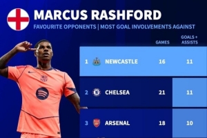 體育資訊9月19日訊 巴薩在本輪歐冠焦點戰(zhàn)2-1力克紐卡斯爾,拉什福德雙響建功。數(shù)據(jù)統(tǒng)計顯示,紐卡也是拉什福德生涯進球最多的對手之一。