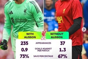 由于阿利森受傷,瑪瑪達(dá)什維利很可能在本場臨危受命。英超官方也盤點了阿利森此前登場與否對于利物浦的影響,具體如下: